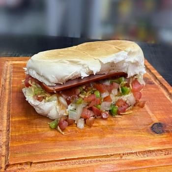 Pão, queijo, frango desfiado, calabresa, catupiry, ovo, bacon, alface, tomate, maionese e ketchup