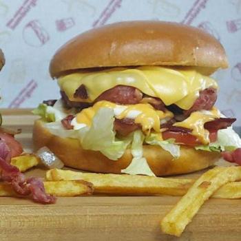 Pão,hambúrguer, frango desfiado, queijo, calabresa, catupiry,bacon, alface, tomate, maionese e ketchup