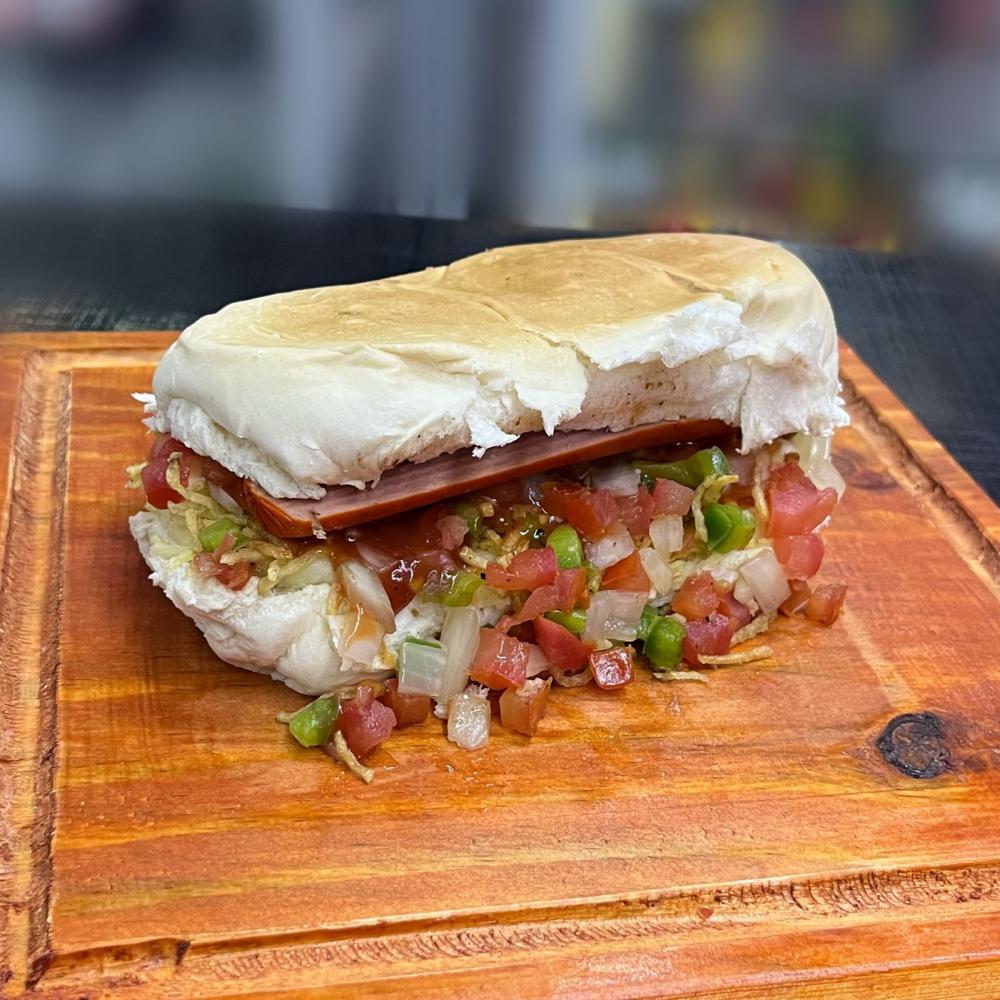 Pão, salsicha, purê de batata, batata palha, vinagrete, maionese e ketchup