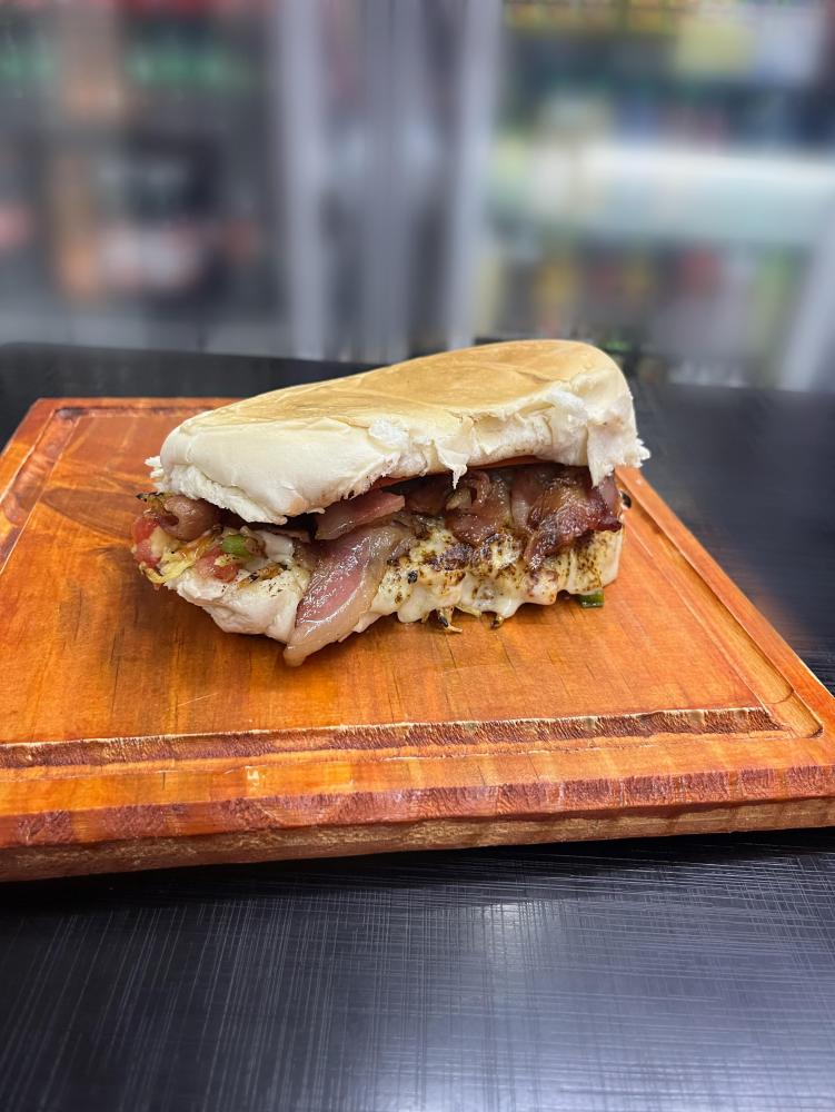 Pão, queijo, calabresa, salsicha, purê de batata, batata palha, vinagrete, maionese e ketchup