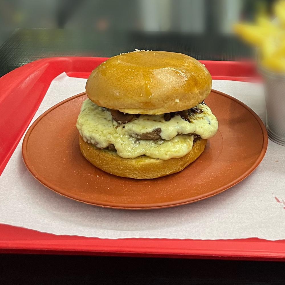 Pão de brioche, 2 hambúrguer de (100g cada), creme de gorgonzola, bacon caramelizado, cebola roxa, molho de alho e barbecue